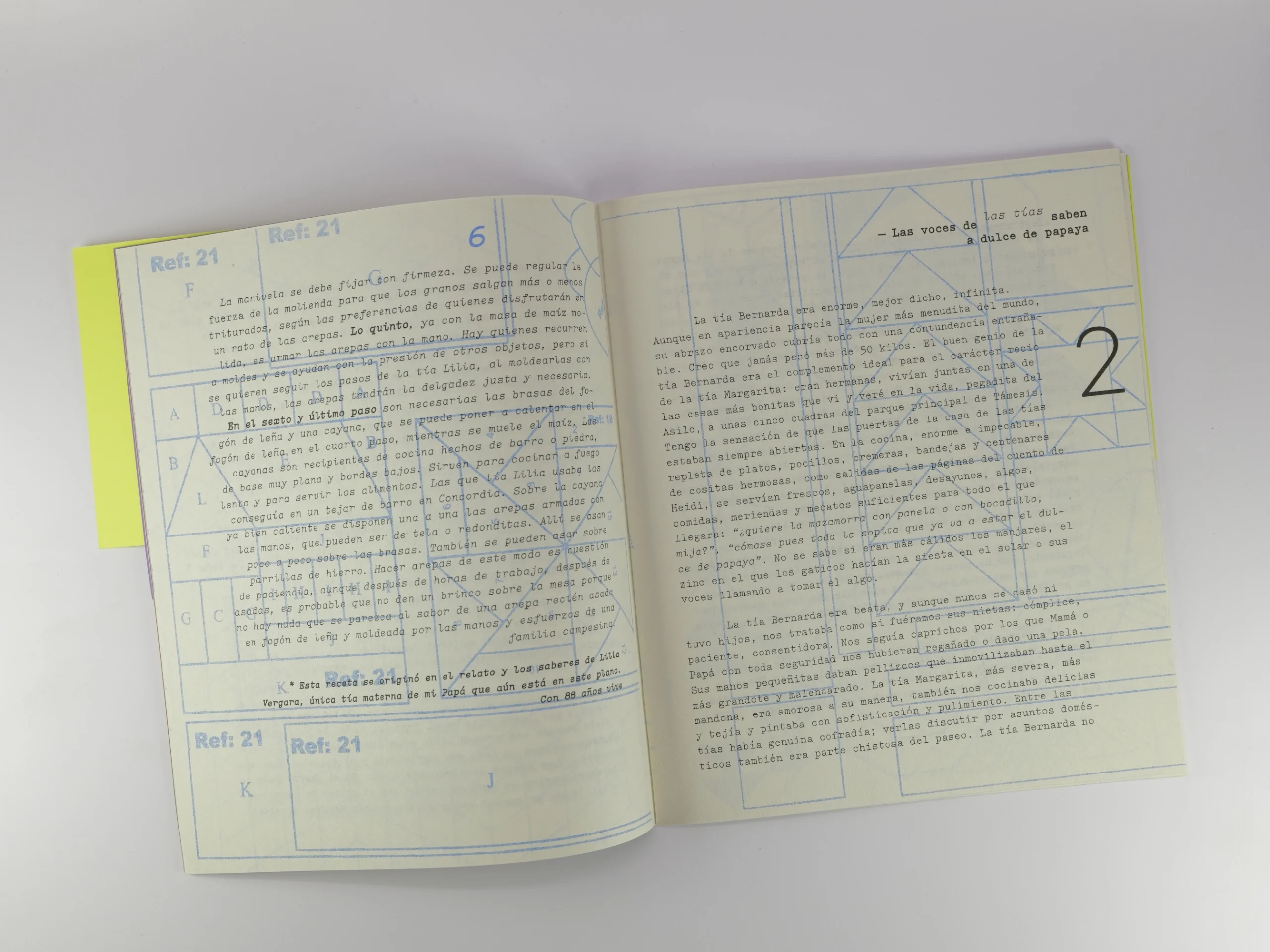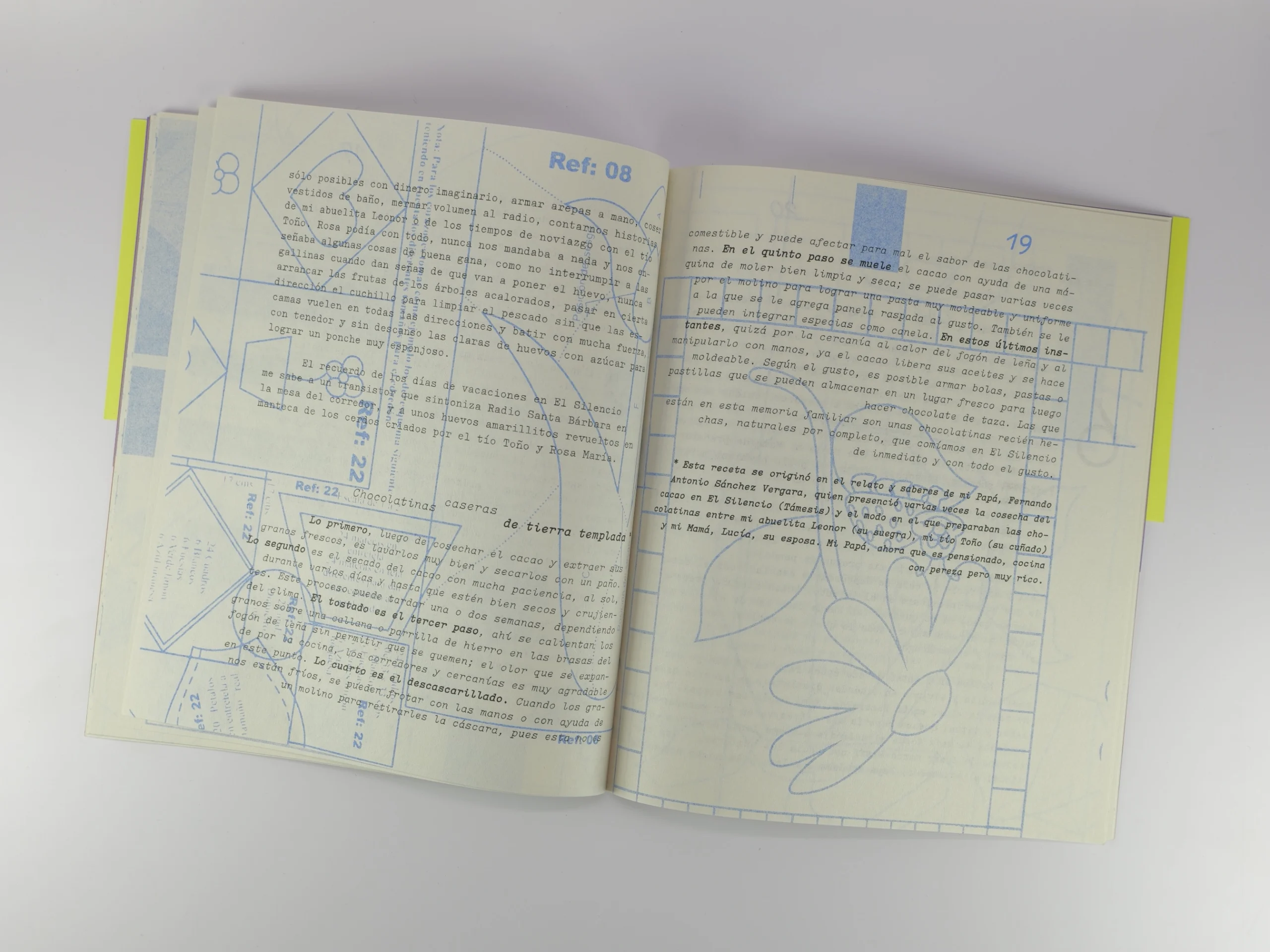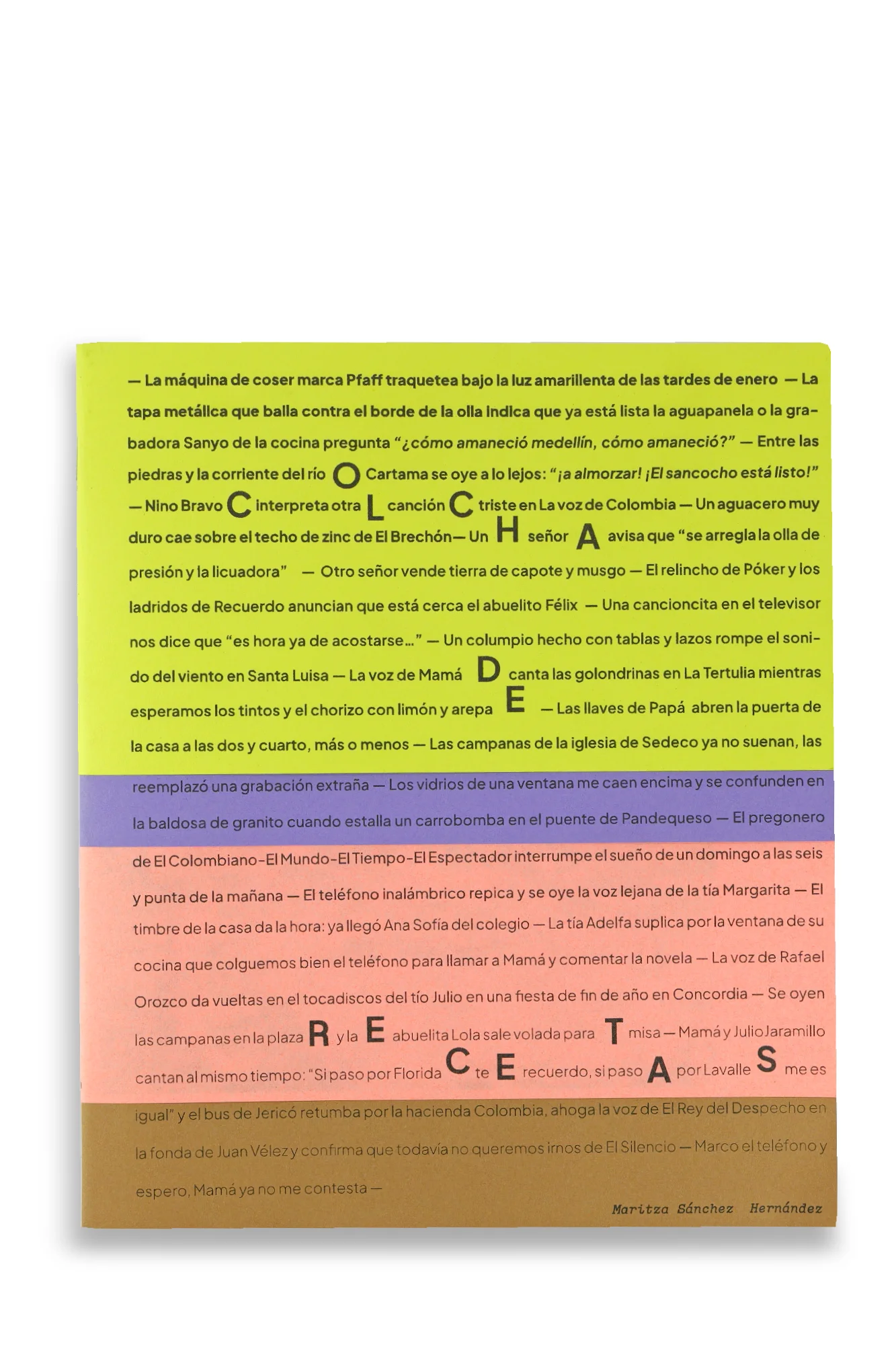 En la portada es posible recorrer un paisaje sonoro escrito sobre cuatro tonos y al final… el libro no termina, hay siete fichas disponibles para que quienes leen, lo sigan escribiendo, esculquen también en su memoria y preserven, si quieren, sus recetas y relatos de familia.