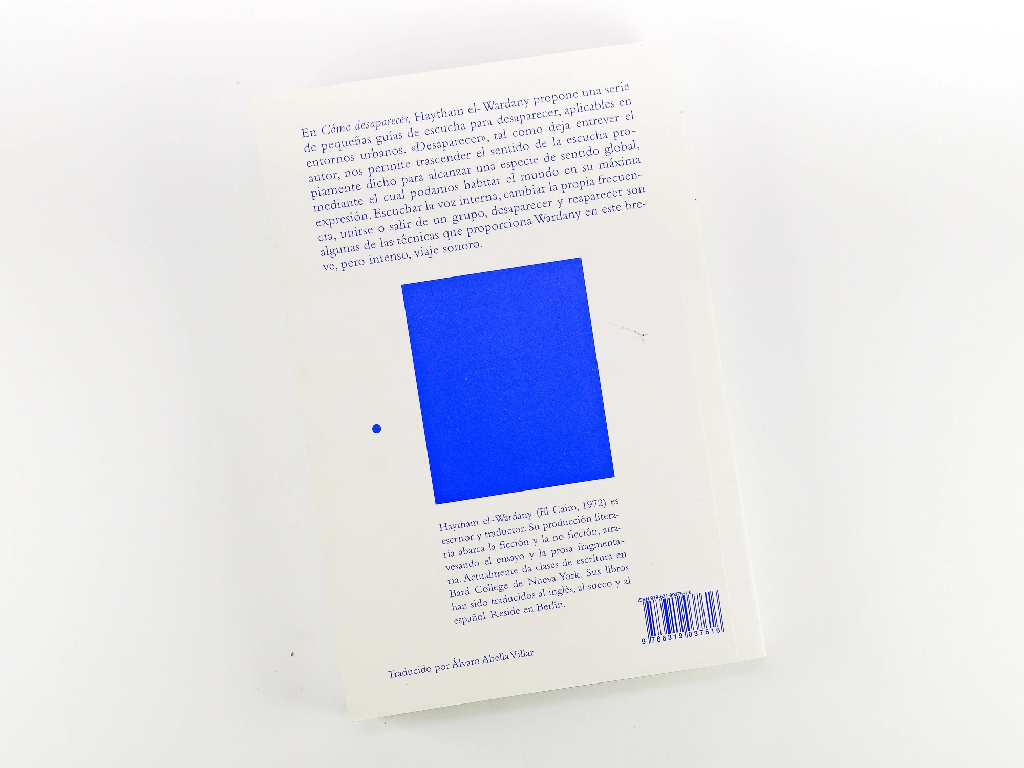 En Cómo desaparecer. Manual para oyentes urbanos, Haytham el-Wardany propone una serie de pequeñas guías de escucha para desaparecer, aplicables en entornos urbanos. «Desaparecer», tal como deja entrever el autor, nos permite trascender el sentido de la escucha propiamente dicho para alcanzar una especie de sentido global, mediante el cual podamos habitar el mundo en su máxima expresión. Escuchar la voz interna, cambiar la propia frecuencia, unirse o salir de un grupo, desaparecer y reaparecer son algunas de las técnicas que proporciona Wardany en este breve, pero intenso, viaje sonoro.