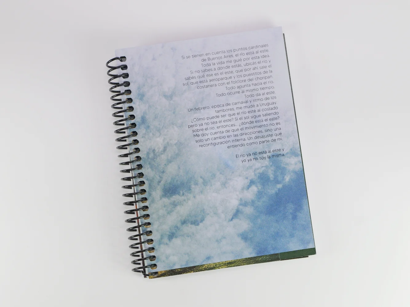 El río ya no está al este es un fotolibro sobre migrar. Pero con un punto de vista diferente, desde adentro. ¿Cómo se reconfigura unx internamente, cuando todo alrededor cambia de dirección? ¿Qué rol cumple el agua? El Río de la Plata atraviesa toda la publicación y nos permite navegar en él, yendo y viniendo en el tiempo. La autora atraviesa las turbulentas aguas del no encontrar un lugar de pertenencia, la casa que conocía ya no es la misma y el nuevo espacio aún pide ser habitado. “El río ya no está al Este y yo ya no soy la misma”.