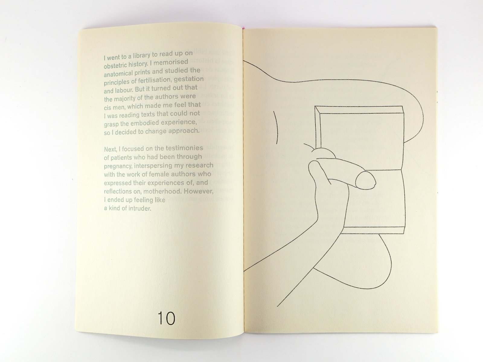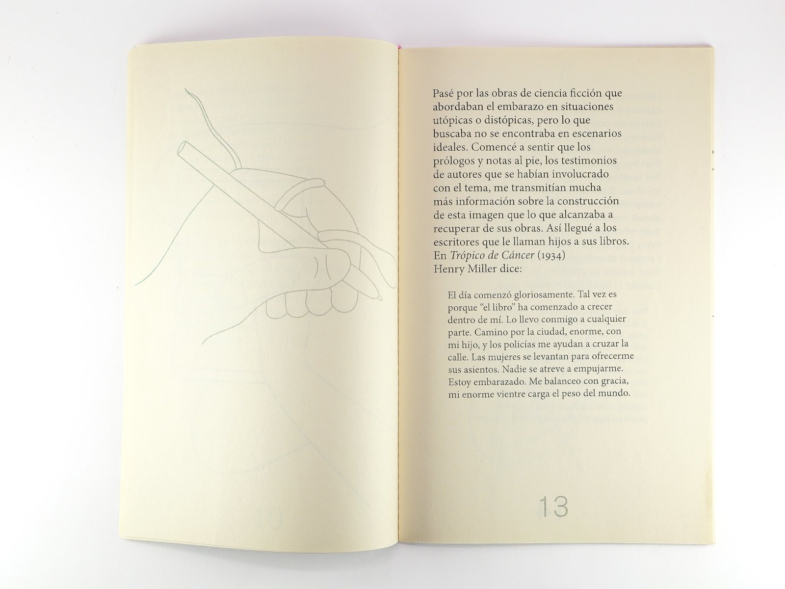 Fábula encinta explora la imagen del embarazo masculino en la literatura y biografías de escritores. El trabajo gira específicamente en torno a la retórica de autores que se refieren a sus obras como descendencia ya su proceso creativo como gestación.