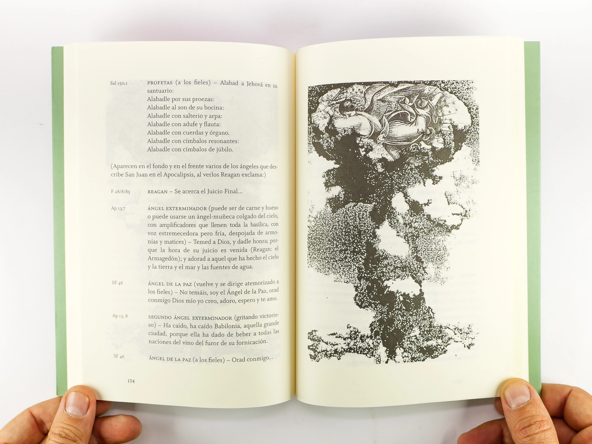 Además, este collage literario cuenta con imágenes, collages visuales donde el artista mezcla plantas de iglesias con cuervos o palomas, bombas atómicas con imágenes religiosas o hasta una Venus de Milo superpuesta sobre la imagen de la creación del hombre tomada de la Capilla Sixtina. Esas imágenes no están disociadas del diálogo, sino que se vinculan a él: leemos citas sobre la guerra o la paz, por ejemplo, al tiempo que vemos las representaciones del hongo atómico”. –Agustín Díez Fischer