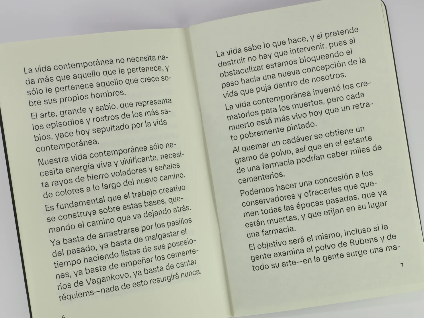 Malévich aboga por la destrucción de lo preservable como condición necesaria para la creación de lo nuevo, un arte (suprematista) que enfatiza su propio poder espiritual y, sobre todo, transformador. “Nuestra vida contemporánea debería tener como lema ‘Todo lo que hemos hecho está hecho para el crematorio’. La creación de un museo contemporáneo es una colección de proyectos contemporáneos y nada más; sólo aquellos proyectos que puedan adaptarse al esqueleto de la vida, o que conduzcan al esqueleto de nuevas formas, podrán conservarse durante un tiempo”. La vida de la forma. Sobre la destrucción de los museos es un manifiesto provocador escrito con afiladas astillas de un acero frío y resplandeciente que sueña con el neón que todavía no existe.