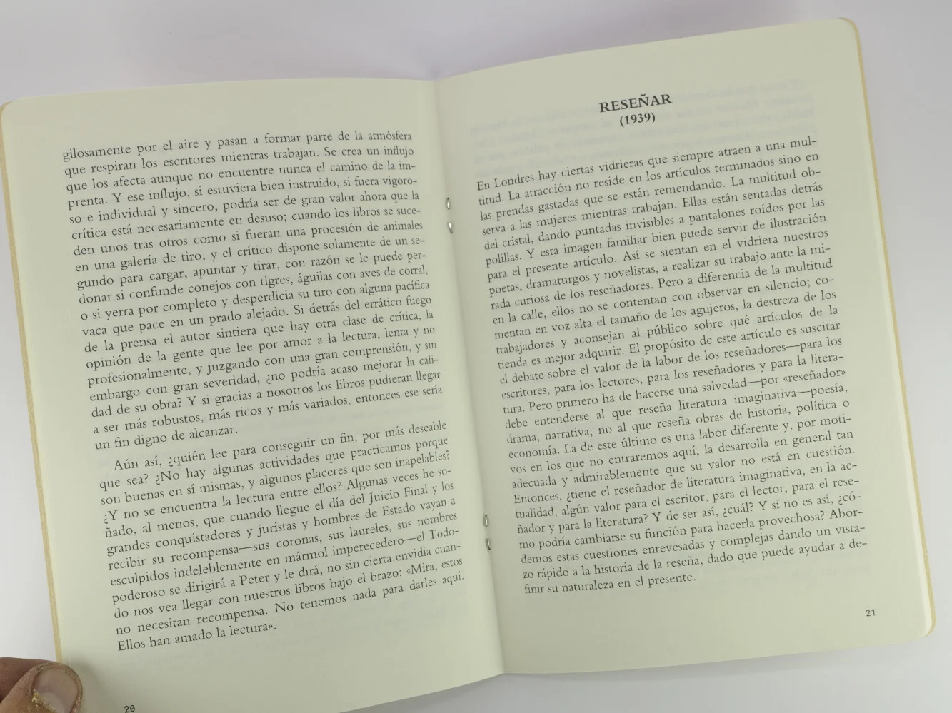 “How One Should Read a Book” fue una lectura que Virginia Woolf dio en un colegio de señoritas de Kent en 1926. El mismo año el texto revisado apareció en The Yale Review y en 1932 como parte del libro The Common Reader: Second Series. “Reviewing” (1939) fue el cuarto título de la colección Hogarth Sixpenny Pamphlets y en 1950 se publicó como parte de The Captain’s Death Bed.
