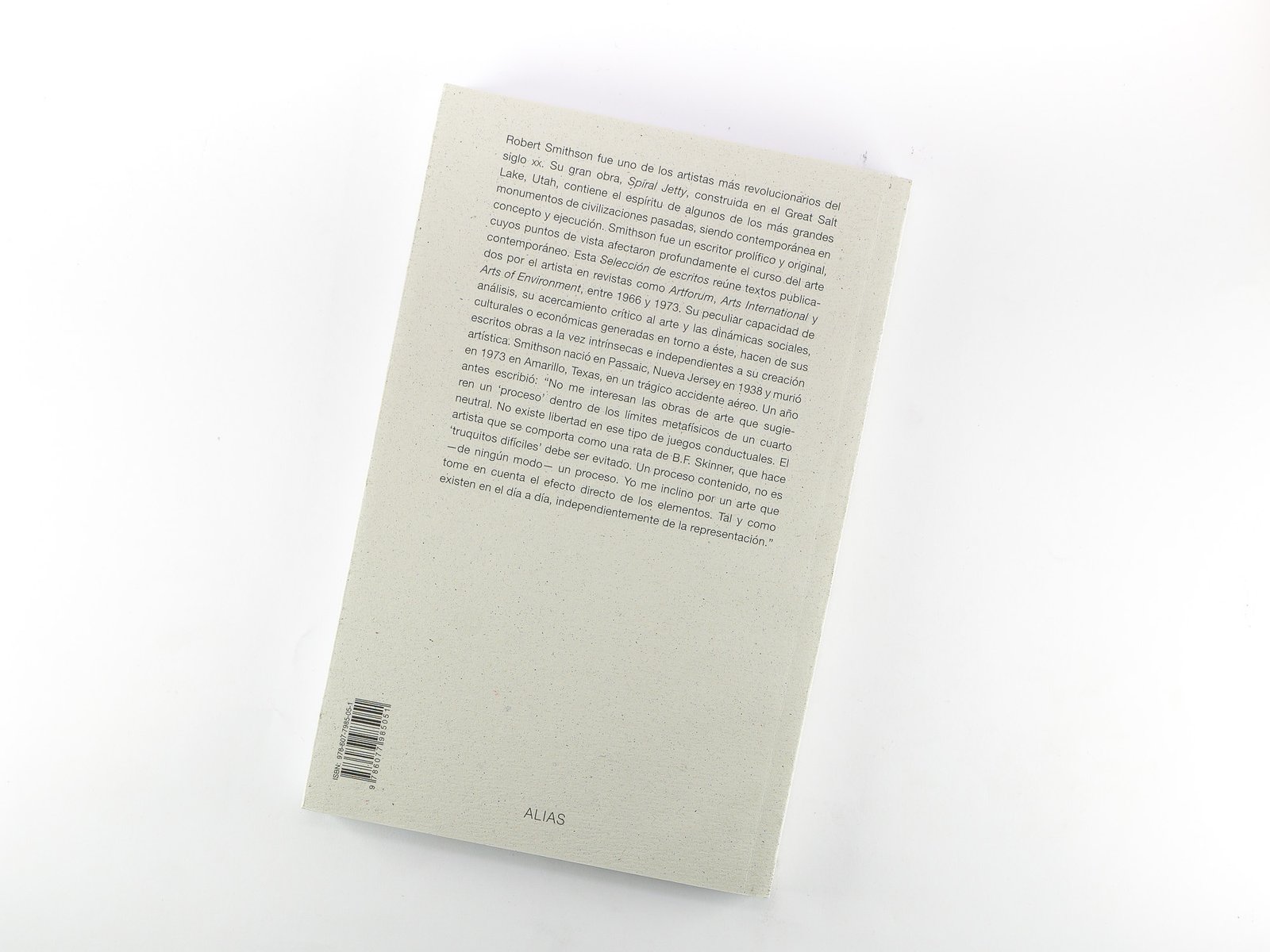 Robert Smithson fue uno de los artistas más revolucionarios del siglo xx. Su gran obra, Spiral Jetty, construida en el Great Salt Lake, Utah, contiene el espíritu de algunos de los más grandes monumentos de civilizaciones pasadas, siendo contemporánea en concepto y ejecución. Smithson fue un escritor prolífico y original, cuyos puntos de vista afectaron profundamente el curso del arte contemporáneo. Esta Selección de escritos reúne textos publicados por el artista en revistas como Artforum, Arts International y Arts of Environment, entre 1966 y 1973. Su peculiar capacidad de análisis, su acercamiento crítico al arte y las dinámicas sociales, culturales o económicas generadas en torno a éste, hacen de sus escritos obras a la vez intrínsecas e independientes a su creación artística. Smithson nació en Passaic, Nueva Jersey en 1938 y murió en 1973 en Amarillo, Tejas, en un trágico accidente aéreo. Un año antes escribió: “No me interesan las obras de arte que sugieren un ‘proceso’ dentro de los límites metafísicos de un cuarto neutral. No existe libertad en ese tipo de juegos conductuales. El artista que se comporta como una rata de B.F. Skinner, que hace ‘truquitos difíciles’ debe ser evitado. Un proceso contenido, no es —de ningún modo— un proceso. Yo me inclino por un arte que tome en cuenta el efecto directo de los elementos. Tal y como existen en el día a día, independientemente de la representación”.
